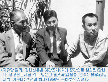 그러나 경향신문에 기고를 하던 대학교수들도 「자유당 처사가 부당하긴 하지만 서명은 곤란하다」며 움츠리더군요. 작고한 趙芝薰(조지훈) 詩人, 소설가 馬海松(마해송)씨는 두말 않고 도장을 찍더라구요. 知性人이란 이런 것이구나 하고 느꼈습니다』