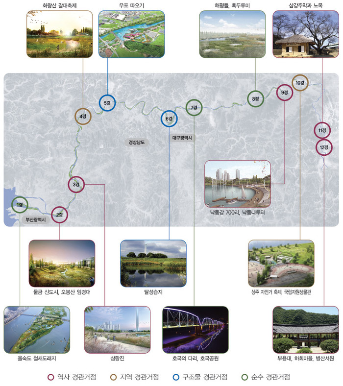 낙동강 12경 중 을숙도는 생태습지, 화왕산은 지역문화축제(억새축제), 낙단보는 낙동나루터, 부용대와 하회마을, 병산서원은 문화자원과 낙동강 풍경을 조망하는 공간으로 특화된다. 또 상주보는 억새풀을, 해평들은 구미보와 철새도래지를 테마로 한 경관으로 조성된다.