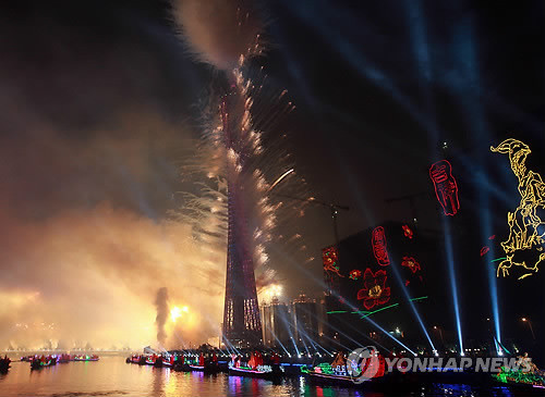 마침내 저녁 9시. 하이신사를 마주보고 우뚝 솟은 광저우의 랜드마크 `광저우타워(廣州新電視塔)'에서 엄청난 폭죽과 불꽃이 폭발하면서 심혈을 기울인 공식행사가 시작됐다.