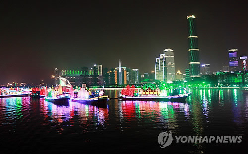 한국선수들을 태운 배는 63빌딩과 남대문 미니어처로 장식되는 등 각 국의 상징물로 조형된 배들이 화려한 불빛을 내뿜는 주변 풍경속에 개막식장을 향해 9.3㎞를 항해했다.