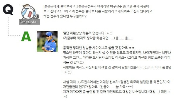 봉중근은 12일 오후 '만약 봉중근 선수가 여자라면 어떤 야구선수와 사귀어보고 싶은 지'를 묻는 질문에 "그런 상상을 해본 적은 없지만 듬직한 정대현 선수를 사귀어 보고 싶을 것 같다"며 "(정대현 선수는)과묵하지만 내 여자에게는 너무나 자상한 차가운 도시남자 스타일이다"고 답했다.