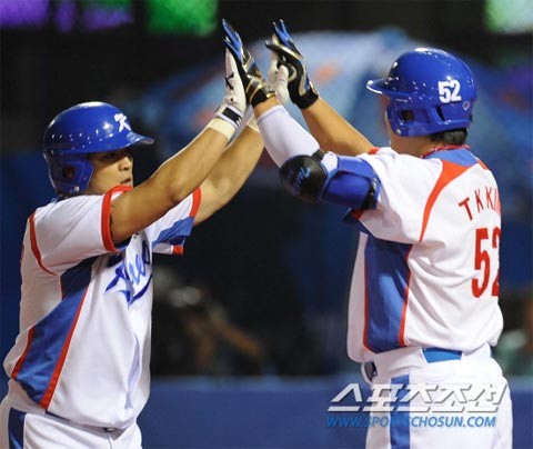▲ 광저우 아시안게임 야구 한국과 대만의 경기에서 추신수가 1회에 이어 3회 두번째 타석에서도 투런 홈런을 치고 김태균과 하이파이브를 하고 있다.