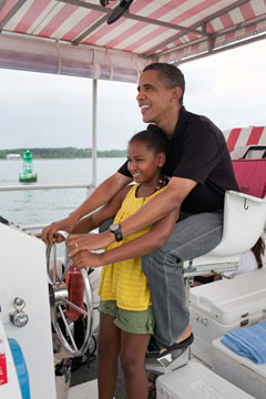 파나마시티 파이어릿 섬에 있는 미니어쳐 그린에서 사샤가 볼을 한번만에 홀에 집어넣자 오바마 대통령과 미셸 여사가 팔을 치켜들고 축하해주는 모습(사진 상), 딸과 함께 요트 운전대를 잡고 있는 모습(사진 중앙), 수영을 하는 모습(사진 하)은 정치무대에서의 모습과는 사뭇 대조적이다.