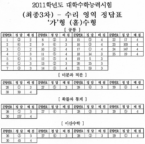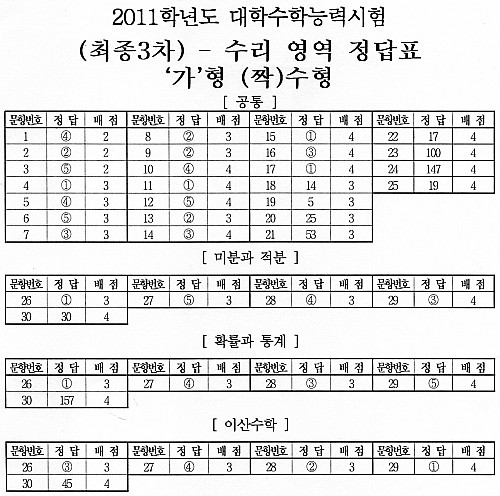 2011년 대입 수능 정답 - 수리영역 '가'형 (홀·짝수형)