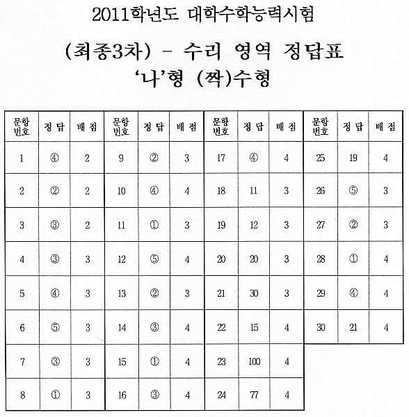 2011년 대입 수능 정답 - 수리영역 '나'형 (홀·짝수형)