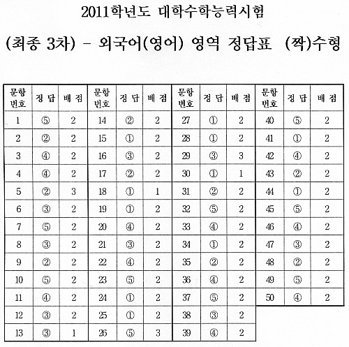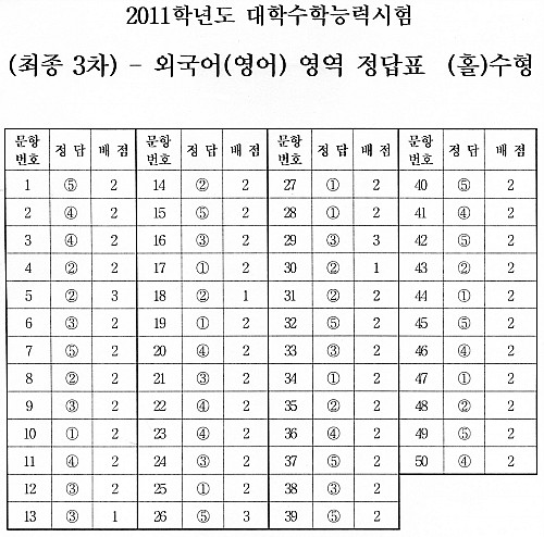 2011년 대입 수능 정답 - 외국어영역 (홀·짝수형)