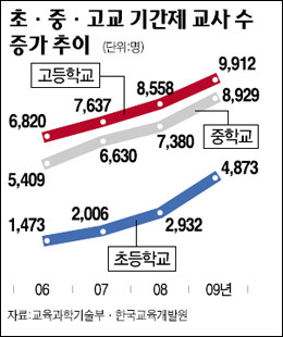 17일 경기도교육청이 도의회에 제출한 행정사무감사 자료에 따르면 경기도내 비정규직(기간제.시간제) 교사는 2008년 7천259명(초등 1천565명, 중등 5천694명)에서 2009년 9천50명(초등 1천610명, 중등 7천440명)으로 1천791명이 늘어났다.