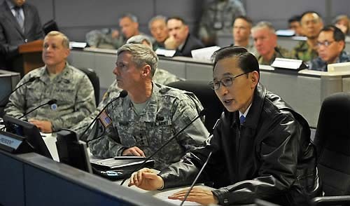 이에 월터 샤프 한미연합사령관은 "이번 훈련을 통해 한미간 연합방위 능력이 향상되고 있다. 양국간 정보공유를 위해 감시 및 정찰에 만전을 기하고 있다"며 "이 대통령의 방문을 통해 우리는 한미동맹의 중요성에 대해 대통령이 충분히 이해하고 있다는 강력한 메시지를 대내외에 과시할 수 있게 됐다"고 답했다.