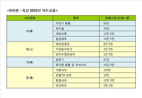 ◇ 이(異) = 대체상품과 달라진 패션 인기상품을 뜻한다. 배추 등 채소값이 급등하면서 배추를 대신해 절임배추(10만2천포기) 판매가 증가했고 김치나 단무지 등도 수요도 급증했다. 저출산으로 애완동물을 가족처럼 기르는 이들이 증가해 애완의류(12만7천벌) 등 애완용품이 히트상품에 올랐다. 버스 안전사고 이후 대중교통 대신 자전거를 이용하는 이들이 늘어나면서 자전거를 비롯한 자전거 용품이 65만개 판매됐다.