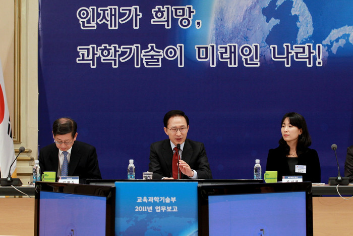 10년 후를 대비한 교육정책과 관련, 이 대통령은 "10년 후에는 고등학생 졸업자 수가 줄어들게 되어 결과적으로 대학 입학생 숫자가 지금보다 절반 가량 줄 전망"이라면서 "10년 후 대학 입학생이 반으로 줄면 어떻게 될 지 등을 염두에 두고 정책을 마련해야 한다"고 당부했다.