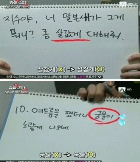 또 박보람은 '여드름을 짰더니 국물이 노랗게 나오네'라는 문제에서도 '국물'을 '궁물'로 적어 김지수로부터 "충격적이다"란 말까지 듣게됐다.