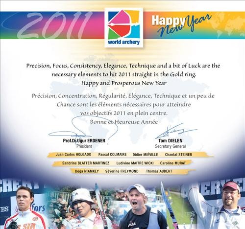 국제양궁연맹(FITA)은 23일 집행부 이름으로 세계 양궁 팬들에게 보낸 연하장에 윤옥희와 브래디 앨리슨(미국.이상 리커브), 세르지오 파그니(이탈리아), 알비나 로기노바(러시아.이상 컴파운드)의 사진을 새겼다.