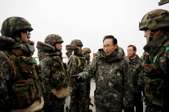 이 대통령은 이날 험준한 최전방 동부전선 산악지역을 책임지고 있는 육군 제21사단 백두산 부대를 방문해 장병들을 격려하면서 이같이 밝히고 "대한민국은 평화를 사랑한다. 한반도 평화를 이루고 평화적 통일을 원하고 있다"면서 "우리는 전쟁을 하고자 하는 것이 아니라 억제하고자 한다"고 말했다.