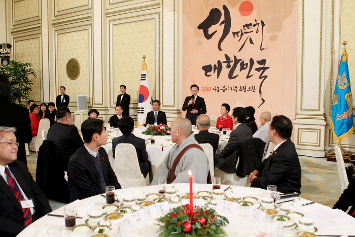 이 대통령은 아울러 "금년 한해 좋은 일도 많았고, 좋지 않은 일도 많았다. 한해를 보내면서 다 털고 내년 한해는 이 땅에 기쁨과 평화가 깃들었으면 좋겠다"면서 "내년에도 어려운 한해이긴 하지만 국민 모두가 힘을 모으고, 여러분이 따뜻한 마음 나누면서 내년 한해도 좋은 한해, 따뜻한 한해, 행복한 한해 기대한다. 모두 건강하고 새해에는 원하는 일 이뤄지기 바란다"고 말했다.