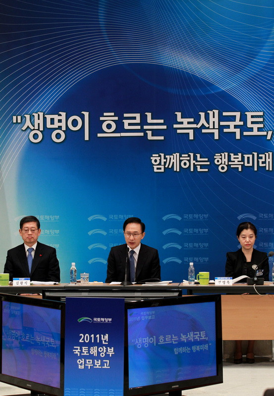 이어 "세계 모든 나라가 기후변화에 거스르는 사업은 할 수가 없다. 선진국은 도로보다는 철도, 강으로 사업한다"면서 "도로에서도 어떻게 하면 CO2를 줄일까가 공통된 목표다. 국토해양부는 물론 산하 관련 부서도 모두 이런 시대적 지구적 당면 과제를 인식하고 사업을 해야 한다"고 주문했다.