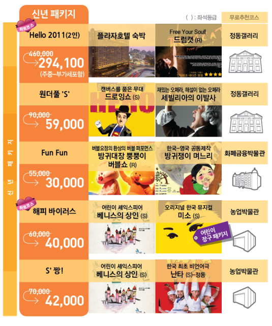 '오감만족' 상품에서는 '난타' 공연을 '미앤미(美앤味)'는 오페라 '세빌리아의 이발사' 공연을 한식·중식·이탈리안 식사와 함께 즐길 수 있다. 또 '감성만들기' 패키지는 엔리오 모리꼬네의 뮤지컬 '미션'과 광화문아띠 외식 코스가 함께 구성됐다.