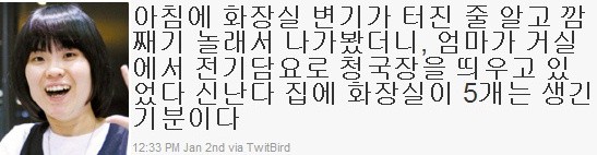 "아침에 화장실 변기가 터진 줄 알고 깜째기 놀래서 나가봤더니, 엄마가 거실에서 전기담요로 청국장을 띄우고 있었다. 집에 화장실이 5개는 생긴 기분이다."