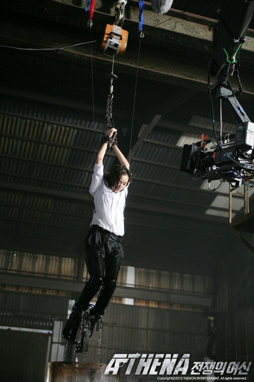 드라마 '아테나 : 전쟁의 여신'을 통해 '니킥수애', '도끼수애' 등으로 연일 화제를 모으고 있는 수애가 다시 한번 놀라운 모습을 선보였다. 그녀의 '액션 본능'이 살아나는 와이어 물고문 장면의 비하인드 스토리가 공개된 것.