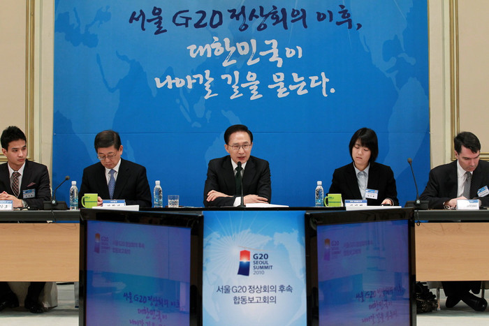 이 대통령은 이날 오전 청와대에서 'G20 이후, 대한민국이 나아갈 길을 묻는다'를 주제로 열린 서울 G20(주요 20개국) 정상회의 후속 합동보고회의를 주재하고 "G20 이후에 대한민국은 선진 일류국가로, 국제사회에 책임을 다하는 성숙한 민주국가로 역할을 하는 출발점에 있다"며 이같이 말했다.