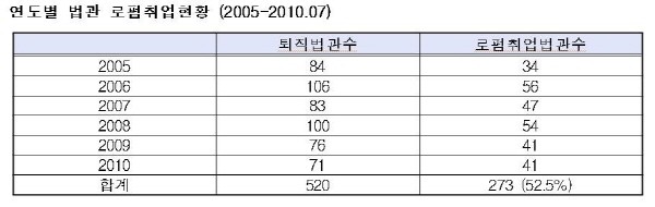 지난해 국감에서 대법원과 법무부가 국회 법제사법위원회 소속 한나라당 이정현 의원에게 제출한 자료를 살펴보면, 최근 5년간 퇴직한 판사 520명 가운데 절반이 넘는 273명(52.5%)이 로펌행을 택했다.