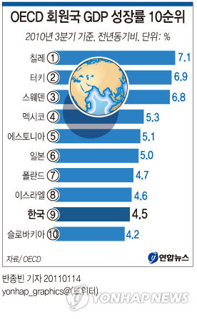OECD의 지난해 3분기 국내총생산(GDP) 현황 보고서에 따르면 한국의 작년 3분기 GDP는 전년 동기 대비 4.5% 늘어 칠레(7.1%), 터키(6.9%), 스웨덴(56.8%), 멕시코(5.3%), 에스토니아(5.1%), 일본(5.0%), 폴란드(4.7%), 이스라엘(4.6%)에 이어 9번째로 높았다.