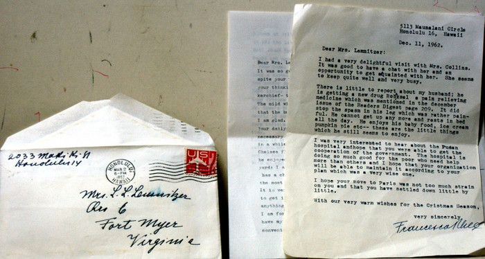 ▲프란체스카 여사가 6·25 당시 주한 제7보병사단장이었던 렘니처 장군의 부인에게 보낸 편지. 이승만 대통령이 더 이상 일어나지 못하고 종일 침대에만 누워있어야 한다고 쓰고있다.(1962년 12월11일)