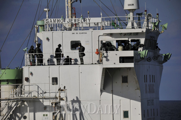 UDT 작전팀이 선교에 있던 해적을 진압하고 안전하고 신속하게 선원들을 대피시키고 있다.