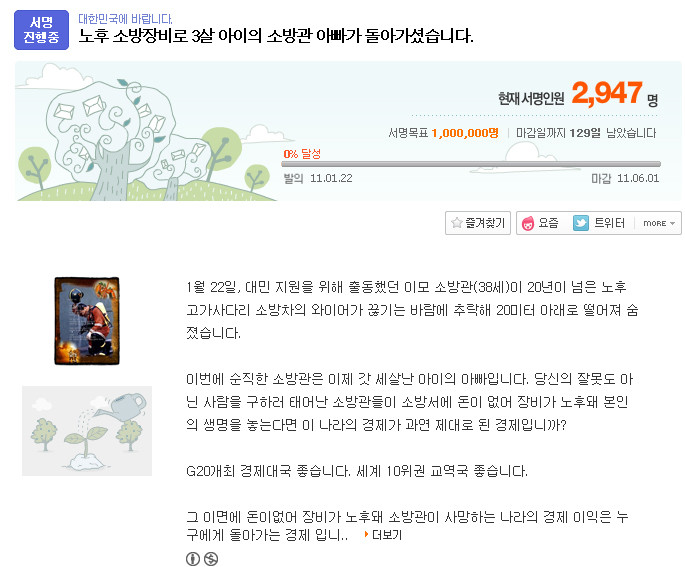 24일 다음 '아고라'에는 '소방관은 국민을 구합니다. 이제 여러분이 소방관을 구해주세요'라는 청원이 올라와 관심을 모으고 있다.