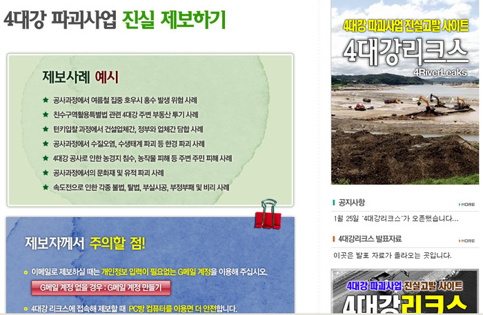 ‘4대강리크스’사이트 홈엔 ‘공사과정 여름철 집중호우시 홍수발생위험사례’ ‘친수구역활용특별법 관련 4대강 주변 부동산투기사례’ ‘공사과정 문화재및 유적파괴사례’ ‘공사로인한 농경지침수 사례’ 등을 제보 사례로 예시했고, “이메일 제보시 개인정보가 필요없는 G메일을 이용하라” “피시방 컴퓨터를 이용하라”고 안내하기도 했다.