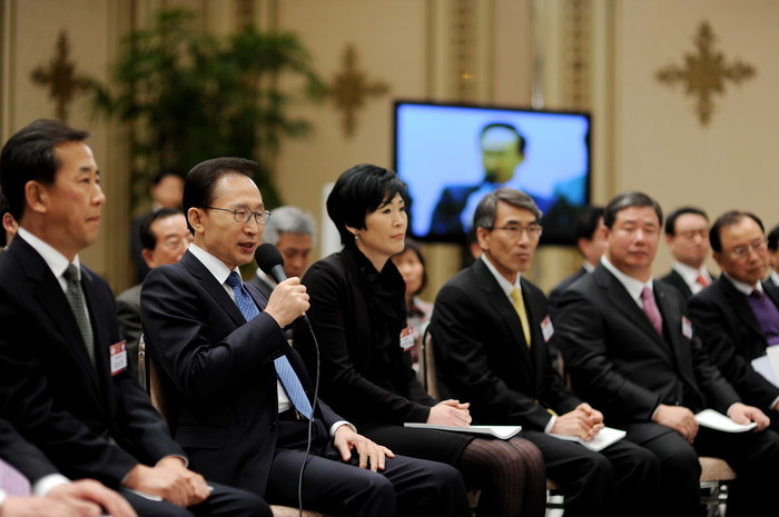 - ▲ 이명박 대통령이 26일 청와대 영빈관에서 열린 '중소기업 경쟁력 제고를 위한 간담회'에 참석해 중소기업 대표들과 성공사례 발표 및 토의를 지켜보고 있다. ⓒ 청와대