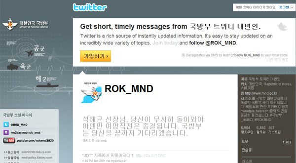 국방부는 트위터(@ROK_MND)에도 “석해균 선장님, 당신이 무사히 돌아와야 아덴만의 여명 작전은 종결됩니다. 국방부는 당신을 끝까지 기다리겠습니다”라는 메시지를 띄웠다. 국방부 관계자는 “현재 트위터에서 이 메시지를 팔로잉하는 사람들이 많다”며 “지금 우리 국민들 모두가 석 선장의 회복과 쾌유를 희망하고 있다. 빨리 건강한 모습으로 돌아왔으면 좋겠다”고 말했다. 국방부 트위터의 팔로어는 약 6900명이다.