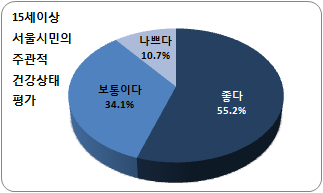 서울시가 통계청 2010 사회조사 자료를 분석한 결과에 따르면 총 4600여명의 조사대상 중 55.2%가 자신의 전반적인 건강상태에 대해 긍정적으로 인식하고 있는 것으로 나타났다.