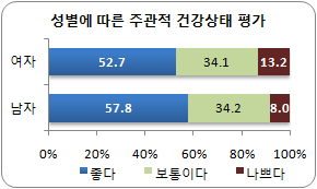 자신의 주관적 건강상태가 '좋다'는 응답비율은 남성이 57.8%로 여성 52.7%보다 5.1%p 높은 반면, 나쁘다는 응답은 여성이 남성보다 5.2%p 높았다.
