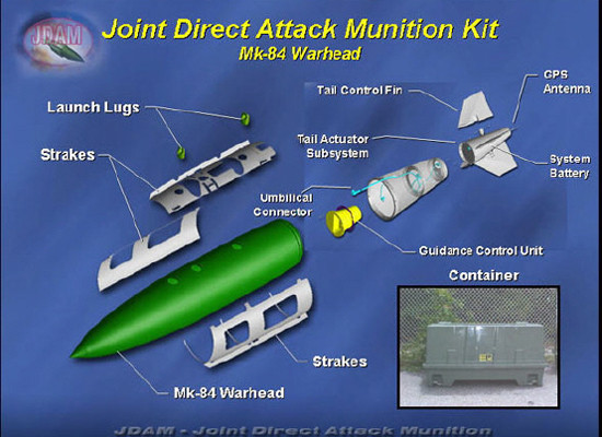 JDAM(GBU-31, Joint Direct Attack Munition)은 일종의 폭탄개량 키트(Kit)다. 기존의 재래식 폭탄에 유도장치와 날개를 장착해 정밀유도폭탄으로 변신한다. 유도장치에는 GPS(위성항법장치)와 INS(관성항법장치)이 포함돼 주․야간 전천후 정밀폭격이 가능하다. 우리 군이 사용하는 JDAM은 1,000 파운드(약 480kg)급 폭탄에 장착되며 사정거리는 24km다.