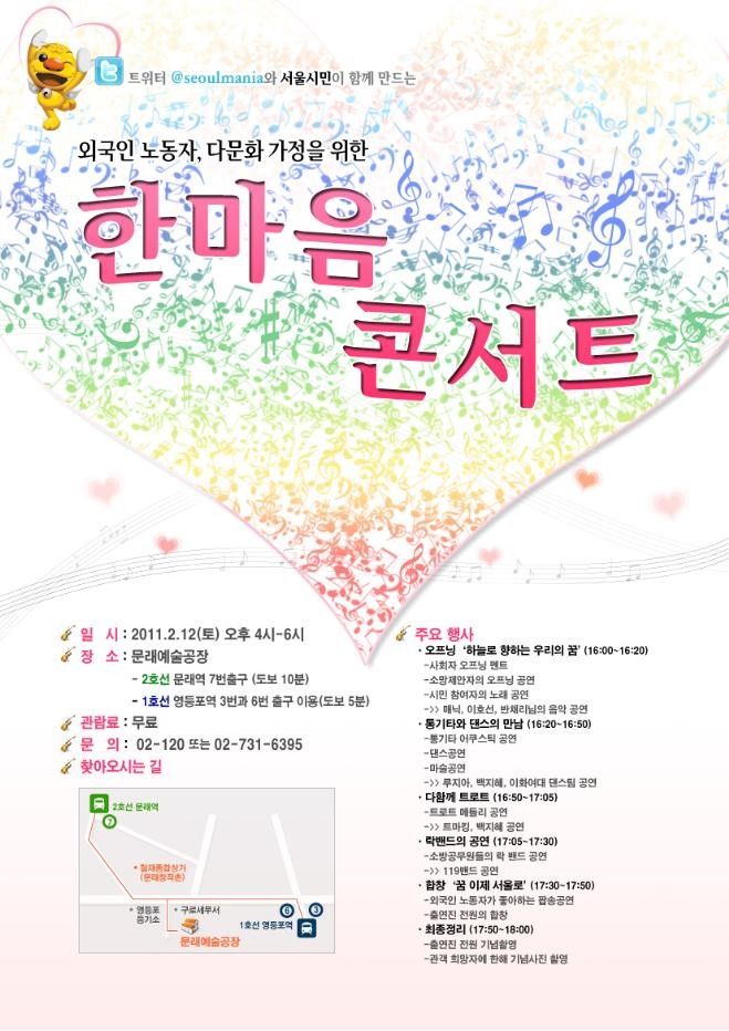 시는 오는 12일 오후 4시부터 6시까지 문래예술공장에서 외국인 노동자와 다문화가정을 대상으로 ‘한마음 콘서트’가 펼친다고 밝혔다.