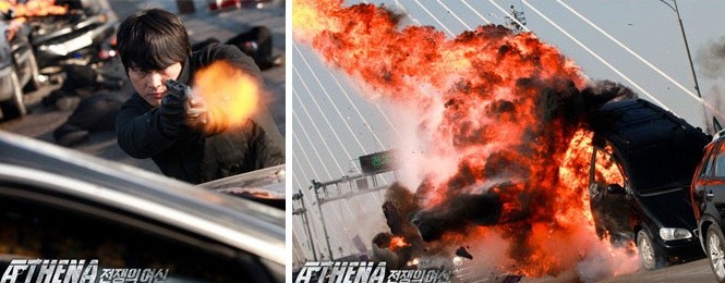 우리나라 최대의 대교인 인천대교 위에서 벌어진 인천대교 액션신이 '아테나' 최대의 액션신으로 꼽혔다. 200여명의 배우와 스태프, 헬기를 동원한 스펙터클한 촬영, 차량 폭파신과 총격신 등은 그 어떤 영화와 드라마에서도 보기 힘들었던 명 장면으로 꼽힌다.