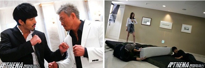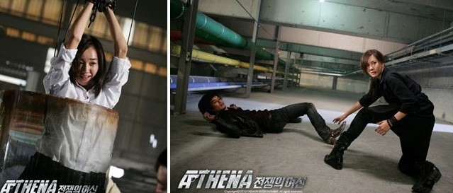 '전쟁의 여신'이라는 제목답게 '아테나'에서는 여배우들의 액션 활약이 그 어떤 작품보다 돋보였다. 특히 수애는 쇠사슬에 매달려 수조 속에 빠지는 물 고문 장면까지 대역 없이 소화해낼 정도로 액션을 향한 뜨거운 열정을 보여왔었다. 그로 인해 ‘니킥수애’라는 애칭은 물론 ‘액션수애’라는 애칭까지 얻었다. 촬영 전부터 액션에 대한 뛰어난 감각을 자랑했던 이지아 역시 남자배우 못지 않은 파워 액션을 자랑했다. 그녀가 선보인 ‘코브라 트위스트’는 차승원이 최고의 액션으로 꼽을 정도. 놀라운 액션 연기를 선보이며 여배우의 액션의 장을 넓힌 그녀들의 활약이 '아테나'의 또 다른 명 장면으로 꼽혔다.