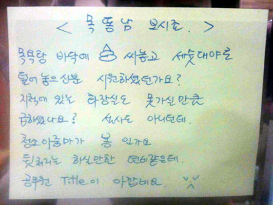 메모에는 “목욕탕 바닥에 X 싸놓고 세숫대야로 덮어 높으신 분, 시원하셨던가요? 지척에 있는 화장실도 못 가실 만큼 급하셨나요? 설사도 아니던데. 청소아줌마가 봉인가요. 뒤처리는 하실만한 연세 같은데. 공무원 Title(직함)이 아깝네요”라고 적혀 있었다.