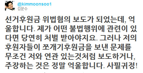 김 지사는 9일 밤 자신의 트위터를 통해 “선거후원금 위법혐의 보도가 되었는데, 억울합니다. 제가 어떤 불법행위에 관련이 있다면 당연히 처벌 받아야지요”라며 “그러나 저의 후원자들이 쪼개기 후원금을 보낸 문제를 무조건 저와 연관 있는 것처럼 보도하거나, 주장하는 것은 정말 억울합니다”라고 남겼다.