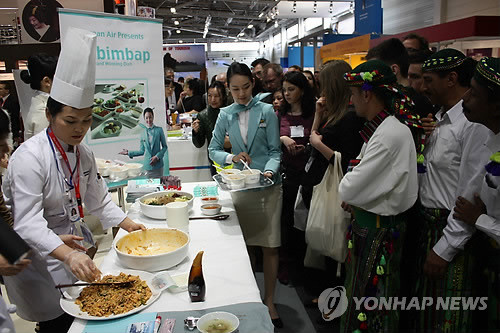 대한항공은 10일 세계 최대의 관광박람회인 베를린 국제관광박람회(ITB)에서 대표적인 한식 기내식인 비빔밥을 관람객들에게 선보였다.
