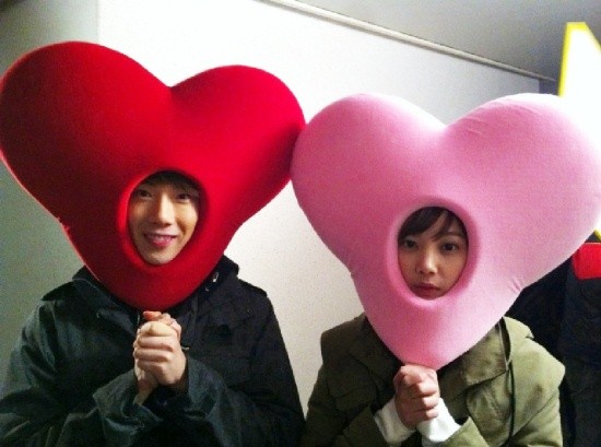 사진 속 두 사람은 핑크와 레드색 하트 모양의 큰 탈을 쓴 채 두 손을 꼭 모으고 애교 섞인 표정까지 선사하며 '귀요미 커플' 다운 모습을 선보였다. 얼마 전 공개됐던 윤승아와 조권의 빨간색 후드 커플티 인증 사진에 이어 두번째다.
