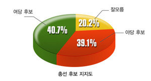 정당지지도별로는 한나라당 지지 응답자 78.3%가 여당후보를, 민주당 지지 응답자 84.8%가 야당후보를 지목했다.