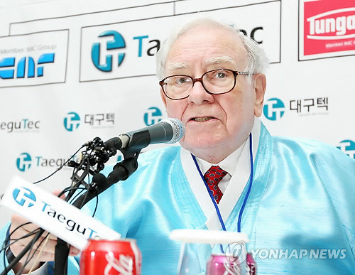 대구를 방문한 워런 버핏 버크셔 해서웨이 회장은 21일 "4년 전 한국을 찾았을 때 포스코를 비롯해 한국 내 몇 개 기업에 투자를 하고 있다고 밝혔는데 지금도 한국기업에 투자를 하고 있다"고 밝혔다.