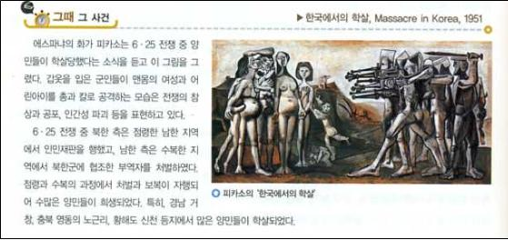 이 교과서는 북한군이 점령지에서 행한 학살을 '인민재판'이라고만 표현, 마치 적법한 재판을 거친 것처럼 誤導하였다. 양민 학살이 이뤄졌다는 地名에서도 북한군과 좌익들에 의한 학살지(서울대 병원, 대전형무소, 전라남도 등)는 제외하였다. 신천 대학살이란 미군과 아무런 관련이 없는, 북한정권이 창작한 거짓말이다. 교과서의 이런 악질적인 서술에 등장한 피카소 그림을 전교조 교사들이 어떻게 이용할 것인가?