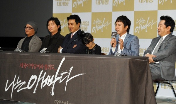 6일 오후 서울 롯데시네마 건대입구에서 열린 영화 '나는 아빠다' 언론·배급 시사회에 참석한 김승우는 "그동안 줄곧 선한 역을 맡아 오다 이번엔 손병호 선배와 대척점에 서 있는 악랄한 배역을 맡게 됐다"며 "만약 늘 하는 것처럼 제가 착한 인물을 연기하고 손 선배가 나쁜 역을 맡았다면 지금처럼 재미있지는 않았을 것"이라고 밝혔다.
