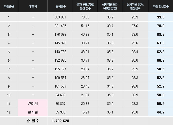 다음은 지난 8일 진행된 생방송 무대 점수에 따른 참가자 순위.