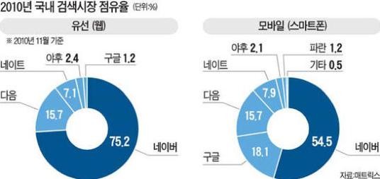 국내 1위 검색엔진 네이버가 무선에서도 약 50%  점유율을 지키고는 있지만, 모바일시장의 성장과 편의성을 중요시하는 트렌드 등을 볼때 언제 어떤 상황변화가 벌어질지 모른다.