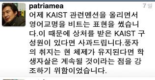 한국과학기술원(KAIST) 학생의 잇단 자살을 비판하며 자신의 트위터에서 카이스트가 '킬러기술원'이라고 표현했던 조국 서울대 법학전문대학원 교수가 자신의 발언을 사과했다.