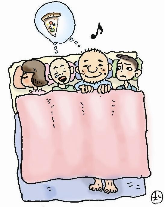 결국 식구 모두가 거실에서 나란히 누워 자기로 타협했다.