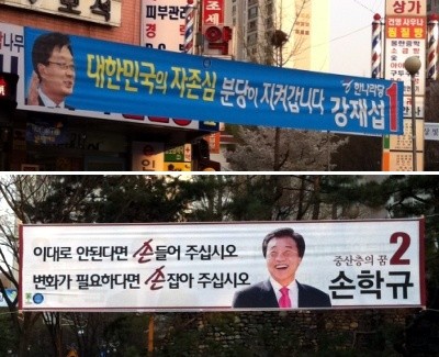 19일 오후 6시 10분. 손 후보의 유세가 예정된 분당동 건영상가 앞 사거리에는 두 후보의 플래카드가 나란히 자리하고 있었다. 강재섭 후보는 한나라당을 상징하는 파란색을 배경으로 ‘한나라당 기호 1번 강재섭’이라는 문구가 사진과 함께 배치됐다.